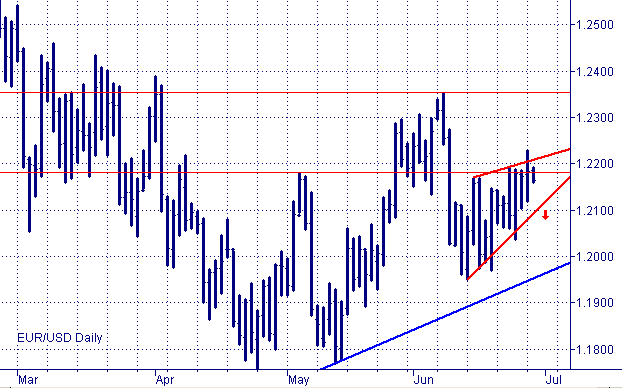 Евро/доллар продолжает формировать "медвежий клин". Вчерашний прорыв выше верхней границы фигуры оказался ложным, поскольку цены закрылись внутри нее. Срабатывание модели, то есть прорыв ценами нижней границы клина, позволит спроецировать цель в пределах 230 пунктов от точки прорыва. Однако главным в этом случае окажется поддержка в виде двухлетнего аптренда, который сейчас проходит в области $1.1950. Факт того, что рано или поздно эта поддержка будет пробита сомнений не вызывает, поскольку цены не могут повышаться вечно, весь вопрос заключается лишь в том, сколько еще раз евро окажется способным оттолкнуться от нее. Последние попытки выливались в неубедительный рост, что указывает на риски скорого прорвы этой ключевой для евро поддержки. Напомним, одно из условий перелома тенденции мы уже получили. Речь идет о формировании модели разворота "двойная вершина" с максимумами в районе $1.29. Рекомендация: продажи, стоп $1.2235, цель $1.21, $1.1950.