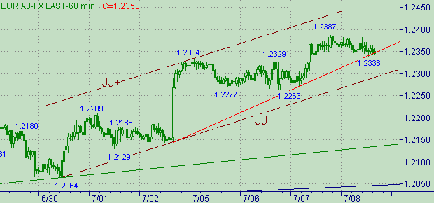 В рамках коррекции от локального up-тренда с началом от вчерашнего минимума, равного 1.2271, евро/доолар умудрились "переписать" максимум этого восходящего движения и теперь в истории оно записано как 1.2271(7/07/04)-1.2387(7/07/04) длина 116п. Сейчас рынок находится в неопределенном состоянии с возможными вариантами: коррекция от 1.2271(7/07/04)-1.2387(7/07/04) ; коррекция от 1.2271(7/07/04)-1.2387(7/07/04) с перспективами плавного перехода в нисходящий тренд. Для начала формирования down-тренов техническая картина подготовлена как никогда хорошо - вспомогательные индикативные функции находятся в состоянии или "перекупленности" или совсем-совсем рядом с этим состоянием. "Перекупленность" мы ожидали увидеть только при тестировании области 1.2530-1.2550. Отметим, что как всегда задним числом обнаружили несколько технических отметим в интервале 1.2380-1.2390. "Век живи - век учись ..." Вот будем учиться на предыдущей истории и стремиться обнаруживать всё "передним числом", т.е. не опаздывая от событий.