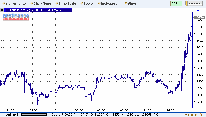 Евро только что достиг новой максимальной отметки $ 1.2445, поскольку сработали стопы выше $ 1.2420. Разговоры указывают на стопы в области $ 1.2450, но дилеры напоминают также об опционном барьере на том уровне. Что интересно, он истекает сегодня в 10.00 по восточному времени. Дальнейшее экспирация касается уже опциона на $ 1.2500. Дилеры отмечают, что доллар находится под влияние негативной статистики. CPI указывает в пользу сохранении в заявлении ФРС фразы о "соразмеренном" повышении ставок, а приток иностранного капитала в США в мае существенно упал, в частности, из-за того, что Банк Японии больше не покупает доллары для поддержания низкого курса йены. Интересно также отметить и то, что некоторые дилеры указали на продажи евро со стороны real-money accounts как раз в тот момент, когда исполнялись стопы. После выхода предварительного индекса потребительской активности Мичиганского университета, который в июле составил 96 пунктов против 95.6 в июне и прогноза в 97, курс доллара возобновил снижение. Американская валюта теряет и против других своих конкурентов. Так, йена выросла более чем на фигуру до 108.67, а фунт достиг максимума с начала марта - 1.8728.