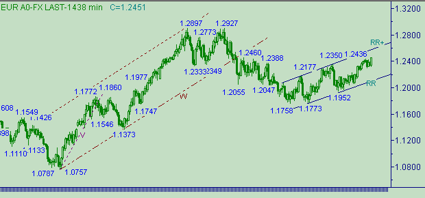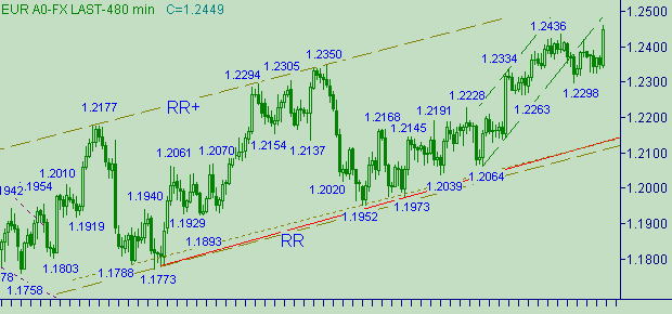 В случае закрытия часа выше 1.2440 будем искать варианты для постановки позиции на покупку с целевыми уровнями 1.2520 и 1.2670. Другой вариант целевой области на рост курса евро - линия RR+ на рис. 1 и 2. Текущее положение линии RR на рис. 1 соответствует значению курса 1.2572.