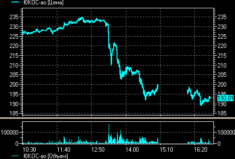 Очередной обвал акций НК "ЮКОС" (с 235 до 193 рублей) спровоцировал решение Московской межбанковской валютной биржи (ММВБ) остановить торги на час в 15:06 мск по этим бумагам. Падение цен акций компании вызвало шквальные продажи всех бумаг российского фондового рынка. Обвала почти никто не избежал, включая тефлоновые акции Сбербанка. Снижение котировок вызвали новости о том, что судебные приставы взыскали с компании более 5 млрд. рублей в счет погашения налогового долга, а пакет акций дочерней структуры НК - "Юганскнефтегаза" (основной добывающий актив компании) - может быть продан в ближайшее время. После возобновления торгов акциями "ЮКОСа" в 16:06 мск падения цен этих бумаг продолжилось.