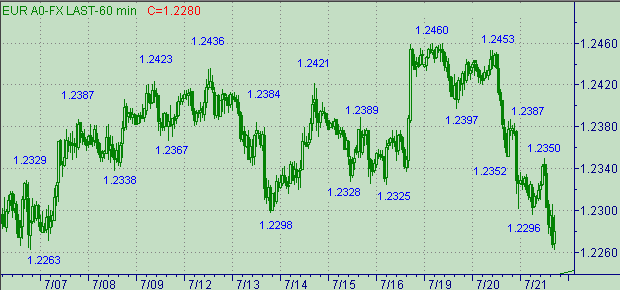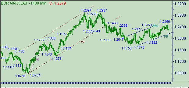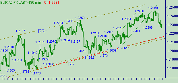 "Вот пуля пролетела и товарищ мой упал?". Какие нежные создания эти тренды. Стоит только пробить закрытием дня-часа-пятиминутки-минуты линию тренда и всё .. тренд закончился. На излете птице подрезают крылья. Обидно. Тренду надо бы жить и жить, радовать и радовать нас своими новыми максимумами/минимумами. Так и хочется видеть идилию: тренд продолжается и продолжается- счет растет и растет. А вот она суровая действительность.. Евро/доллар опускаются ниже 1.2296. И ставится под сомнение канал RR-RR+ на рис. 2. А вдруг да рынок и линию RR не постесняется пробить. В общем, как жить? Ничего не остается - как жили так и будем жить.