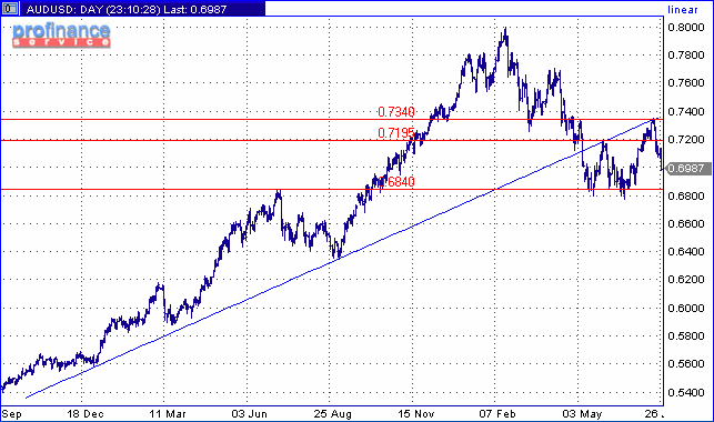 Как и предполагалось ранее, рост доллара продолжился, и поддержка 0.7025/20 оказалась пробита. Технические аналитики из Brown Brothers Harriman, оценивая показания индикаторов дневных графиков, говорят о том, что установившееся на рынке давление сохранится в ближайшее время. Для этого нисходящего движения, они устанавливают цель на 0.6840/45, которая является максимумом июля 2003 года. С верхней стороны стратегами отмечены сопротивления на 0.7195 и 0.7340. Последняя также является значением линии Фибоначчи 61.8% (построение с апрельских максимумов).