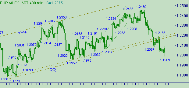 Из множества всевозможных и двух-направленных (или вверх или вниз) вариантов выбираем следующий план: в случае ростак курса до 1.2160 открывать позиции на продажу, стоп-лосс - 1.2191, цель- 1.1700, промежуточные целевые уровни - 1.2000 и 1.1880. Стоп-лосс более грамотно надо выставлять выше 1.2210, но проблема тут в том, что совсем рядом находится область 1.2230