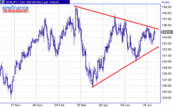 Графики говорят, что консолидация EUR/JPY, вероятно, продлится в течение значительного количества дней или недель. Симметричный треугольник должен будет обеспечить сильное направление впоследствии. Треугольник сформирован линией тенденции к понижению с максимума мая, сейчас на 135.40, и падающей приблизительно на 0.05 в день, и линией аптренда с минимума апреля, 132.15, повышающейся приблизительно на 0.08 в день. EUR/JPY сейчас на 134.86. В то время как эти линии тренда остаются не поколебленными, рынок будет ощущать недостаток любых сильных новостей или других драйверов. Лучшая стратегия торговли - уважать треугольник - то есть продать при любом приближении к верхней границе и покупать при подходе к основанию. Осцилляторы подтверждают, что рынок, вероятно, останется без конкретного направления в ближайшие дни и, возможно, недели; 10-недельный моментум консолидируется внутри его собственного симметричного треугольника, сигналы 12-недельного MACD также никакого направления не дают. Подчеркивая сбалансированность пары в настоящий момент, Citigroup изменил свое краткосрочное представление до нейтрального с бычьего после того, как евро возобновил падение по отношению к доллару в конце прошлой недели. Однако наклоны линий тренда подразумевают, что треугольник по EUR/JPY должен быть пробит к концу следующего месяца; такой прорыв показал бы баланс сил между быками и медведями и стал бы аргументом в пользу одного из лагерей. Это подразумевало бы резкое движение в направлении возможного прорыва в последующие недели; высота треугольника подразумевала бы ход в 5.7 фигур. Разумной целью для прорыва вверх был бы пик марта на 139.08; разумной целью для прорыва нижней стороны был бы июньский минимум на 130.09. В какую сторону будет пробит треугольник? Осцилляторы не дают в этой стадии ясного ответа, но исследование Morgan Stanley дает ответ, исходя из фундаментальных факторов. "Иена получает большую выгоду от восстановления мировой экономики. Поскольку ожидания двигаются к жизнеспособному американскому восстановлению, это должно быть отрицательно для евро/йены", - говорят аналитики банка. Morgan Stanley ожидает, что EUR/JPY ослабится к 134 к концу сентября и 126 к концу декабря.