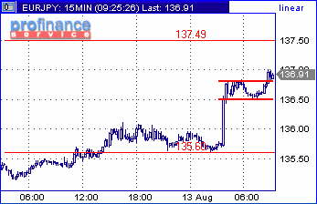 На графике кросса евро/йена мы можем наблюдать образование классической фигуры продолжения - флаг. Стоит обратить внимание, что верхняя граница уже пробита, и происходит тестирование уровня 136.80 снизу вверх. Если отметка сдержит натиск продавцов, то мы вправе рассчитывать на продолжение восходящего движения на половину "древка" как минимум. Цель потенциального роста расположена на уровне 137.50.