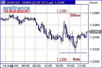 Пара вошла в область 1.2350. Минимумы дня были достигнуты на 1.2315, но, встретив активные покупки, евро восстановил утраченные позиции. Дилеры, оценивая свои мониторы клиентских приказов, отмечают, что в данный момент любая попытка приближения к уровню 1.2300 будет встречена сильными покупками единой валюты. До возвращения крупных участников рынка (конец августа/начало сентября) торговля ожидается в диапазоне. Биды стоят на фигуре 1.2300, офера отмечены на 1.2380.