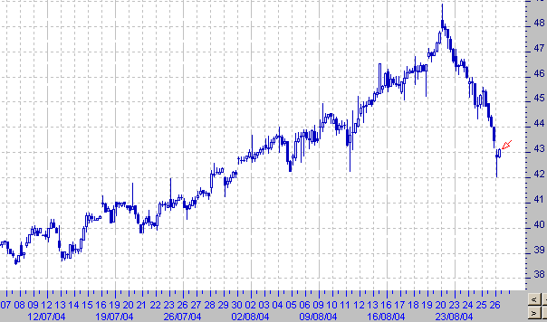 "Восприятие жизнеспособного медвежьего разворота (по нефти) было усилено вчерашним длительным снижением от максимума прошлого четверга", - обращает внимания Том Хобсон, ведущий стратег Merrill Lynch. Взгляд на различные графики, в том числе на графики фьючерсного контракта с поставкой в октябре, показывает, что нефть (текущая - $ 43.10, минимум четверга - $ 42.05) уже пробила поддержку восстановления на $ 44.10 (cont. chart) и $ 43.47 (Oct future), что наводит на размышления о дальнейших потерях. Недельные графики также говорят, что избыточные позиции могут вскоре быть ликвидированы, хотя может потребоваться прорыв ниже $ 42.00, чтобы инициировать серию стоп-лоссов на продажу. Временная поддержка замечена на $ 40.85, но Хобсон одобряет более серьезное тестирование нижней стороны, называя цифру на $ 36.91 и далее $34.48.