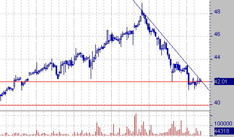 Октябрьские фьючерсы на NYMEX вновь атакуют поддержку на уровне 42 доллара за баррель. Обратим внимание на то, что и в понедельник (минимум 41.30) и сегодня (минимум 41.40) котировки октябрьских контрактов пробивали вышеназванный уровень, но вот завершить торговую сессию ниже этой отметки пока не удается. Технические аналитики Merrill Lynch на прошлой неделе в своих комментариях уже отмечали значимость текущих уровней, говоря о том, что преодоление уровня 42 доллара за баррель позволяет рассчитывать на глубокую коррекцию. Следующую промежуточную поддержку аналитики Merrill Lynch отмечают на уровне 40.00. Цель предполагаемой значительной коррекции расположена на 34.50.