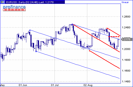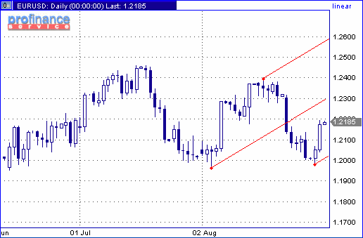 Рассматривая техническую картину в паре евро/доллар на графиках дневного временного интервала, применим как инструмент линейного анализа Вилы Эндрюса (Andrews Pitchfork). В пользу такого решения говорит объективная эффективность данного инструмента для определения ключевых уровней поддержки и сопротивления в рассматриваемой паре. График №1 приведен в качестве доказательства этого утверждения. Вилы Эндрюса устраняют любую возможность подгонки линий под "желаемый результат", что напрямую следует из принципов их построения. Как мы видим на графике №1 сопротивление (первоначально) и поддержка (в последствии) оказались спрогнозированы весьма точно.