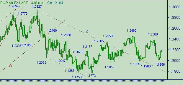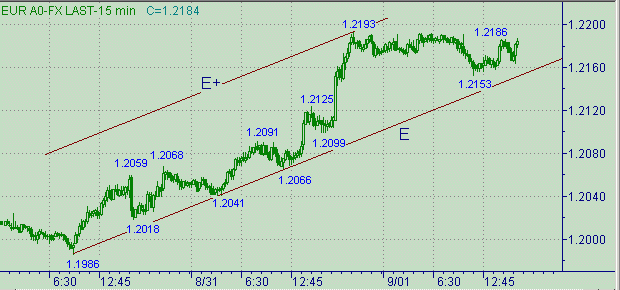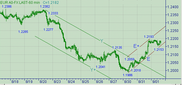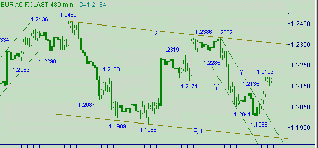 В up- тренде вдоль линии E на рис. 3 и 4 просматриваются ростки длительной по времени коррекции. Начало коррекции создает предпосылки для процесса поиска новой локальной вершины, т.е. уровня от которого "Медведи" попытаются скатить вниз по графику пару евро/доллар. Само движение вдоль линии E на рис. 3 и 4 рассматриваем как первую часть коррекции от down-движения в канале Y-Y+ на рис. 3. Основная беда для "Медведей" это внушительная протяженность в пунктах движения вдоль линии E: 1.1986-1.2193 длиной 207п. В случае, если "Быки" отстоят оборону интервала 1.2100-1.2130, то евро/доллар могут подняться по графику до 1.2300 в увлекательном процессе поиска вершины. В свою очередь в случае формирования второй нисходящей ветки (первая ветка - 1.2386(17/08/04)-1.1986(30/08/04))от области 1.2300, "Медведи" буддируют интерес рынка к линии R+, как цели для этой второй ветки. Но и в самом движении в пределах каналах R-R+ на рис. 2 равенство длин нисходящих поддвижений находится на уровне 1.1894: первое поддвижение - 1.2460-1.1968 длина 492п.; предполагаем начало второго поддвижения от 1.2386. В общем где то близко ложатся цели возможных нисходящих сценариев развития событий.