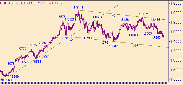 Продолжается нисходящий процесс формирования третьей ветки в движении вдоль линии E на рис. 2: первая ветка - 1.8466-1.8196 длина 270п.; вторая - 1.8343-1.7853 длина 490п.; третья ветка началась от 1.8065. Само движение в третьей ветки проходит следующим образом: первое поддвижение - 1.8065(31/08/04)-1.7850(3/09/04) длина 215п.; второе - 1.7934(3/09/04)-1.7735(3/09/04) длина 199п.; предполагаем начало третьего поддвижение от уровня 1.7846(7/09/04) - см. на рис. 3. На текущий момент важным уровнем для всего нисходящего движения является уровень 1.7850. Выход курса фунт/доллар выше этого значения цены создаст хорошие технические предпосылки для отвоёвывания своих позиций "Быками". Рядом находится и линия тренда - линия E на рис. 2. Текущее положение линии E на рис. 2 соответствует значению курса 1.7915. Выше области 1.7850 рассматриваем в качестве потенциально-целевого интервала диапазон 1.8065-1.8085.