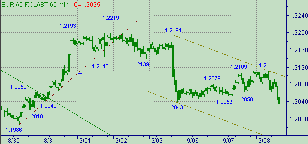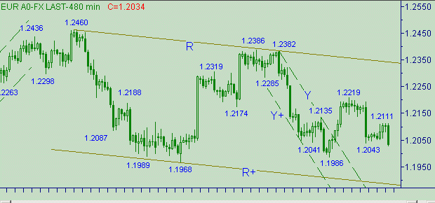 Скромный уровень 1.2100 показал себя настоящим бойцом - всего на 11 п. пропустили оборонные редуты "Медведей" жаждающих повышения курса евро "Медведей". Сейчас обозначился локальный нисходящий канал O-O+ на рис. 4. В канале O-O+ обозначились две ветки: первая - 1.2111-1.2063 длина 48п.; вторая началась от 1.2091. Для этого нисходящего движения важным уровнем является интервал 1.2070-1.2080. Кстати, текущее положение линии O на рис. 4 соответствует значению курса 1.2075. Целевые области для этого движения - 1.2000-1.2020 и 1.1950-1.1965.