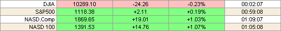 Акции Procter & Gamble Co. оказывали давление на Dow после того, как компания подтвердила свои квартальные перспективы прибылей, но разочаровала тех, кто рассчитывал на повышение прогноза доходов в предстоящих кварталах. Бумаги Procter & Gamble упали на 1.13% до 56.09. Акции Texas Instruments выросли на 10% до 20.77. Торгуемые в США бумаги финской компании Nokia выросли в стоимости на 8.34% до 13.77.