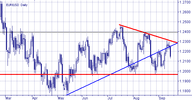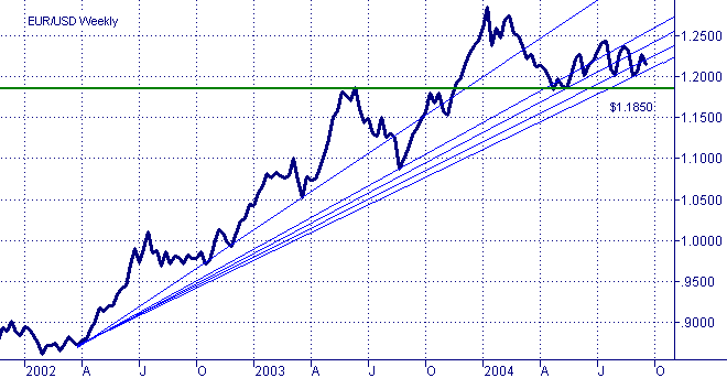 Еще одна попытка евро вырасти закончилась ничем. Рынок даже не протестировал верхнюю границу медвежьего треугольника, что лишний раз подчеркивает слабость единой валюты. Другим признаком превосходства медведей внутри казалось бы нейтрального диапазона $1.970/$1.2460 является прорыв "сходу" сегодняшней свечой поддержки, образованной предыдущим пиком (вершиной) на $1.22. Это говорит о том, что скоро мы увидим тестирование поддержки на $1.2050, образованной предыдущим спадом/дном. Более сильная поддержка находится на $1.1970, а критической поддержкой для евро стоит признать уровень $1.1850. На недельном графике видно, что здесь было несколько разворотных минимумов (спадов) и максимумов (вершин). Анализ долгосрочных трендов указывает на то, что аптренд рынка теряет свою крутизну, что предвещает становление медвежьего рынка, поскольку доверие к пологому тренду, имеющему угол менее 45 градусов, проявят немногие.