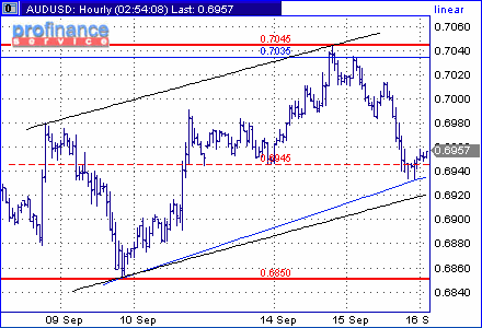 В прошедший торговый день, протестировав максимумы на 0.7035, австралийская валюта возобновила ослабление против доллара. Большинство аналитиков высказывает мнение о том, что давление на "аусси" оказывают предстоящие 9 октября выборы, а также ожидания того, что на очередном заседании RBA не станет поднимать процентную ставку. Дополнительное давление оказывалось со стороны продаж "австралийца" против новозеландского доллара, на фоне позитивных ожиданий продолжения повышения ставки Резервным банком Новой Зеландии, а также продаж против японской йены. Некоторые противники такого варианта развития событий говорят о том, что австралийская валюта падала против доллара только благодаря поддержке последнего со стороны вышедших по США данных. Обращая внимание на техническую картину в паре, он отмечают, что нижняя граница канала (черные линии) не была достигнута, потому как доллару не удалось закрепиться под поддержкой на 0.6945. Исходя из этого, они полагают, что возвращение к 0.7050 в ближайшей перспективе вполне возможно. Пробитие поддержки на 0.6945 - вопрос спорный. Большинство экспертов считают, что уровень был преодолен, и в данный момент мы просто наблюдаем краткосрочную восходящую коррекцию. В этом ключе стоит рассчитывать на тестирование минимумов 9 сентября на 0.6850.