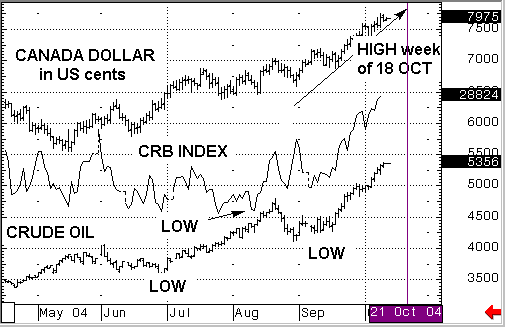 Канадский доллар достиг против американской валюты невиданных в течение многих лет высот. Казалось бы, что совершенного роста уже достаточно, и loonie пора бы уже остановится на своем восходящем пути, однако циклы все еще смотрят вверх. Заметим, что "австралиец" и "новозеландец" также укрепляются, вместе с тем доллар США терпит потери против большинства своих конкурентов, и мы делаем вывод, что циклы устремлены к пику, который должен быть сформирован на следующей неделе 18 октября. Ниже нами приведены графики нефти и индекса CRB, которые на этой неделе также достигают своих циклических пиков. Так или иначе, мы пока не собираемся отказываться от своих длинных позиций по канадскому доллару.