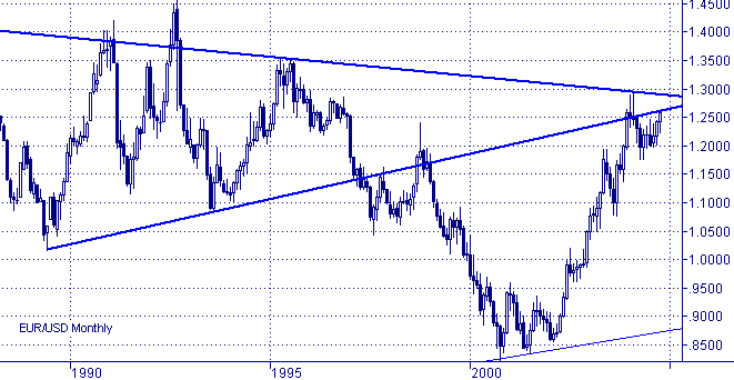 Евро пробил много месячный диапазон, вернувшись в русло аптренда. Высота прямоугольника предполагает рост курса до области максимумов 2004 г. Однако на месячном графике евро приблизился и начинает тестировать линию восходящего тренда, которая ранее служила грубым ориентиром для формирования вершин. Также в районе $1.26 сформирована первая вершина на линейном месячном графике в начале этого года, и теперь медведи могут попытаться сформировать вторую. Прорыв выше оголяет цели на $1.2935.