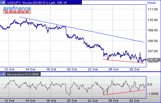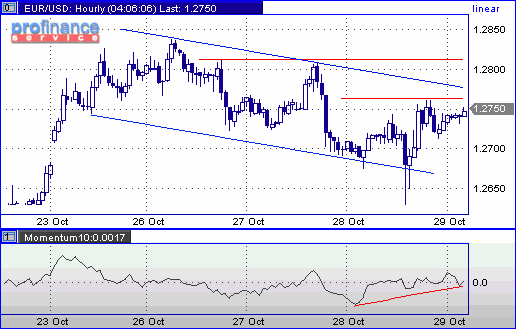 Евро/доллар. После вчерашних свингов, вызванных повышением ставки в Китае, ожидается консолидация. С технической точки зрения краткосрочная перспектива выглядит восходящей, поскольку 10-часовой моментум сохраняет направление вверх. Это позволяет рассчитывать на попытку пробития вчерашних максимумов на 1.2765/67. Пока сигналов дальнейшего роста евро нет, но в случае пробития указанной отметки, стоит ожидать укрепление единой валюты до 1.2813.