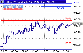 В рамках довольно спокойного рынка пара стабилизировалась в области отметки 106.45. В течение прошедшей торговли неоднократно наблюдалась ситуация, когда после роста на 15/20 пунктов, доллар резко терял приобретенные достижения, но потом продолжал рост снова. Дилеры отмечают, что игроки не желают держать долларовую прибыль и предпочитают после небольшого роста сразу же фиксировать минимальные прибыли. Некоторые американские трейдеры ожидают увеличение закрытия коротких позиций по доллару с приближением завтрашних выборов, полагая, что это может спровоцировать рост до 106.80. Ранее дилеры отмечали серию стопов нескольким выше этой отметки. Твердые предложения расположены на фигуре 107.00.