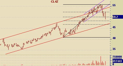 Следует дополнительно отметить, что ценовые движения в понедельник, ровно, как и ожидания высокой волатильности во вторник не отражают реальных рисков основных валют, поскольку ключевое искажение вносят чрезмерно активные действия спекулянтов, для которых слухи и предположения относительно победы Буша или Керри играют доминантовое решение в рамках открытия краткосрочных спекулятивных позиций.light crude dec4 (daily chart)