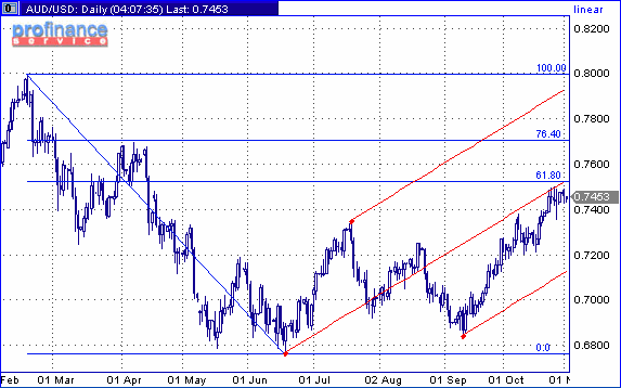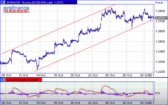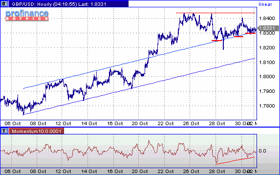 Фунт/доллар. Вчерашние позитивные данные по PMI за октябрь оказали поддержку британской валюте. Однако слабость других экономических показателей пока не позволяет рассчитывать на то, что на заседании банка Англии в четверг будет принято решение о повышении ставок. Рассмотрим техническую картину в паре. Верхняя лини восходящего канала, пробитая 20 октября теперь превратилась в сильнейшую поддержку, поскольку была тестирована три раза, но безуспешно. Восходящая направленность 10-часового моментума позволяет пока надеяться на то, что курс фунт/доллар не опуститься сегодня ниже 1.8300. Ключевым, с среднесрочной точки зрения, сопротивлением является область 1.8440/50.