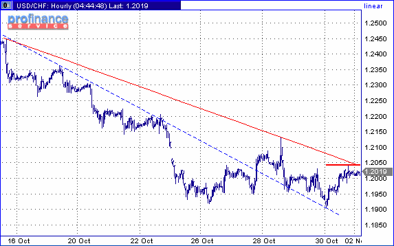 Доллар/франк. Сформировав вчера новый 8-летний минимум на 1.1911, пара совершила резкое корректирующее восходящее движение. Как мы видим, с технической точки зрения курс пары протестировал поддержку, оказанную доллару линией бывшего нисходящего канала, которая была пробита 27 октября. После совершенной коррекции сегодня верхняя граница отмечена на уровне предыдущего максимума в области 1.2045/50. Эта область также является текущим значением линии нисходящего тренда с 15 октября.