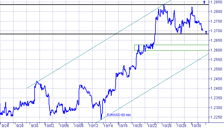 На фоне восходящего тренда евро/доллар взял паузу, консолидируясь в пределах прямоугольника, являющегося, как правило, фигурой продолжения тенденции. Нижняя граница прямоугольника, $1.2680/00, представляет неплохую возможность "встать по тренду" половиной позиции. Вторую половину целесообразно открыть в области нижней границы канала, сформированного от линии аптренда, построенной по вершинам. Здесь, в районе $1.26, кроме того, расположена зона узкой консолидации, которая предоставит дополнительную поддержку единой валюте. Стоп, на наш взгляд, целесообразно установить на $1.2570. Некоторые риски для быков несет возможная реализация двойной вершины на дневном графике. Однако спекулятивное сообщество может не довериться этой фигуре из нестандартных очертаний ее форм, в частности, острых вершин.
