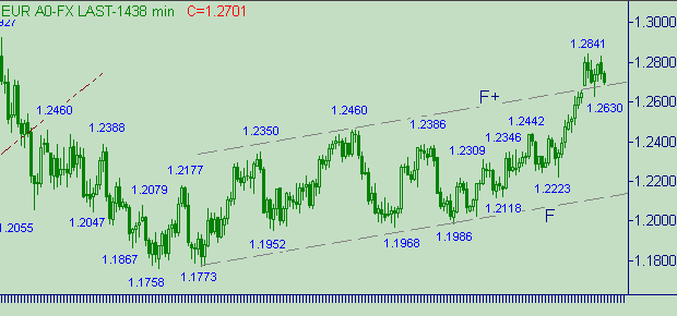 В случае, если час так и не сможет закрыться ниже 1.2700, курса евро/доллар достигнет области 1.2760 искать возможности для рассмотрения позиции на продажу с целью 1.2620 и промежуточными целями на 1.2700 и 1.2660.
