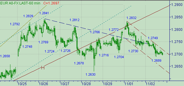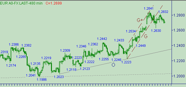 Уровень 1.2700 достигнут. Сточки зрения рассмотрения текущей ситуации как формирование коррекционной формации можем признать, что полет (точнее - снижение) проходит штатно. Все симпатично и со вкусом. Уровень 1.2700 заставляет рынок призадуматься - а может ну их, эти мысли о Down-тренде и попытаться сформировать очередной up-тренд. Следующая подобная точка, удобная для философских рассуждений относительно up-тренда будет только вблизи уровня 1.2620. Разница между потенциальными восходящими движениями с началом от уровней 1.2700 и 1.2620 состоит в том, что если рынок начнет движение наверх по графику от области 1.2700, то это ставит перед нами дополнительные проблемы, связанные с тем, что текущую коррекцию можно рассматривать как от всего роста курса в пределах канала G-G+ на рис. 2 так и от второго восходящего движения в этом канале (движение 2.2449(19/10/04)-1.2841(26/10/04)). Если восходящее движение начнется от 1.2620, то будем считать рост курса с началом от 1.2223(13/10/04) законченным и новый up-тренд будет не продолжением движения в канале G-G+ на рис. 2, а формированием очередной восходящей ветки. Все эти варианты имеют место существовать, пока рынок находится выше 1.2620.