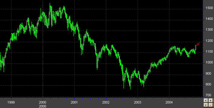 Мнение технических аналитиков Citigroup о дальнейшей динамике S&P 500: "Очень конструктивная картина сложилась сейчас с возможностью дальнейшего роста к новым максимумам с октября 2002. Картина продолжает напоминать очень хорошо выраженную последовательность из 5-ти волн, которая должна выдать ход, по крайней мере, до 1247 и, возможно, ближе к 1300 в ближайшие месяцы. Хорошее начальное сопротивление расположено на 1163 (максимум текущего аптренда) и на 1177 (коррекционный максимум в декабре 2001/январе 2002). Хорошая поддержка расположена на 1142 и 1126."