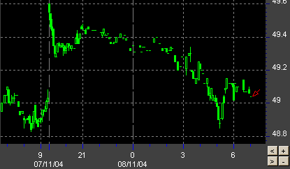 Цены на сырую нефть корректируются на электронных торгах после достижения минимума в Азии на сообщениях о том, что США и иракские вооруженные силы захватили некоторые районы Фаллуджи после того, как Иракский временный совет объявлял вчера 60-дневное чрезвычайное положение. И хотя Фаллуджи не граничит с любыми из главных нефтепроводов, и поблизости нет нефтепромысловых областей, существует угроза распространения насилия во всей стране, включая угрозу новых диверсий на нефтепроводах Ирака. Дилеры также обращают внимание на увеличившуюся неопределенность в вопросе состояния здоровья палестинского лидера Ясира Арафата и потенциальное значение политического вакуума в случае его смерти. Кроме того, потенциальное банкротство российского лидера нефтяной отрасли, компании ЮКОС, и забастовка в Нигерии, все еще вырисовывают риск сильного рикошета цен наверх. Фьючерсы на сырую нефть потеряли $ 2.15 или 4.3 % на прошлой неделе, но недельные данные от Комиссии биржевой торговли по срочным сделкам (CFTC) на 2 ноября показали, что хеджфонды/спекулятивное сообщество увеличило количество чистых длинных позиций по фьючерсам на сырую нефть до 50,127 против 20,963 недели ранее. Декабрьская нефть марки Light Sweet котируется сейчас на электронных торгах на уровне $ 49.08, Brent - $ 45.95.