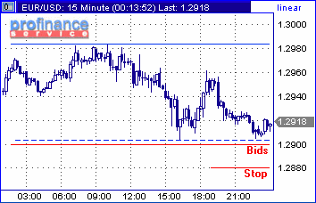 После очередной попытки прохода через фигуру, курс пары отступил в область 1.2920/15. Дилеры отмечают, что по-прежнему на подходе к поддержке 1.2900 появляется связанный с опционом спрос, который и не позволяет "протиснуться" через упомянутую отметку и поглотить стопы. После стольких дней столь безапелляционного роста евро, не многие трейдеры решаются открывать продажи в рассматриваемой паре. Серия стопов отмечена дилерами под отметкой 1.2880.