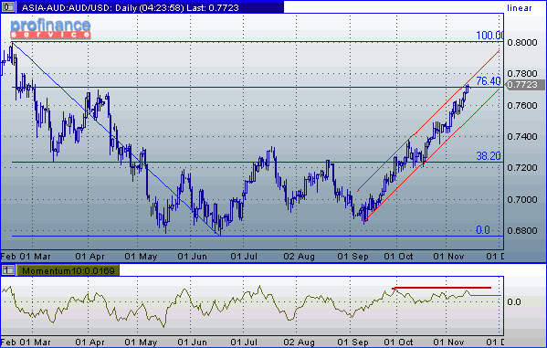 Австралийский доллар/ доллар США. Перекупленный с технической точки зрения австралийский доллар продолжает поражать упрямым ростом. Среднесрочная цель пары расположена на 0.8000, и "аусси" слишком сильно торопится ее достичь. Учитывая скорость двух месячного роста (оцените угол наклона), вряд ли удастся ускорить аптренд. Максимум, на что сегодня может рассчитывать австралийская валюта - это повторное тестирование 0.7745. Стоит обратить внимание на то, что на вчерашнем выступлении управляющий RBA вполне мог бы присоединиться к риторике многих центральных банков в отношении слишком резкого роста курсов их национальных валют относительно доллара. Но господин Макфарлейн отказался комментировать ситуацию на валютном рынке, что позволяет предположить, что монетарные власти Австралии не обеспокоены ростом национальной валюты. С учетом вышесказанного, а также того, что в будущем вероятное изменение процентных ставок в Австралии произойдет, скорее всего, в сторону повышения, нет причин для активации коротких позиций. Консолидацию стоит пережидать либо вне рынка, либо выискивая на коррекциях возможность добавления к лонгам.