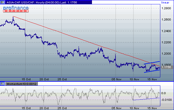Доллар/франк. Линия нисходящего тренда, построченная с 13 октября, играет роль сопротивления в паре (текущее значение 1.1760). С учетом показаний моментума, ее пробитие возможно, хотя и нет однозначных сигналов. В этом случае целью коррекции доллара становится уровень 1.1860. Если же 1.1760 сдержит натиск долларовых быков, курс пары уйдет ниже краткосрочной линии поддержки (синяя линия), то фигура 1.1700, с технической точки зрения, также сдаст свои позиции.