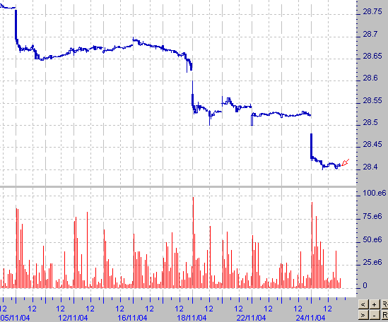 На валютных торгах в среду курс доллара по отношению к рублю пробил внутредневными ценами сильную техническую поддержку в виде основания/зоны консолидации в области 28.45/50. Дневное падение составило привычную "норму" - 10 копеек. Минимальная цена сделки расчетами "сегодня" зафиксирована на уровне 28.4 рубля за доллар, на межбанке - 28.37. Последний раз такая цена была зафиксирована на бирже 3 февраля 2001 г. Основным поводом для снижения курса доллара сегодня стало отсутствия поддержки со стороны Банка России на прежнем уровне - 28.515, а причиной - продолжение падения индекса доллара. Так, курс евро/доллара на FX достиг сегодня нового максимума - $ 1.3167. По мнению экспертов, доллар продолжит снижаться на международном валютном рынке, поскольку ведущие страны не пришли к единому пониманию по вопросу поддержки американской валюты на текущих уровнях. Предыдущее сильное падение доллара произошло в прошлый четверг (до уровня 28.525), когда ЦБ РФ перестал покупать валюту на отметке 28.645 руб./$1. Объемы торгов на бирже остались высокими - только на сделки с расчетами "сегодня" к 12.50 мск в среду пришлось более $1.18 млрд., с расчетами "завтра" - $415 млн. В секторе рубль/евро стоимость европейской валюты на единой сессии ММВБ выросла на 17.4 копейки - до 37.2671 рубля за евро. Всего с евро в этот день на ММВБ было заключено 206 сделок на Е6.216 млн.