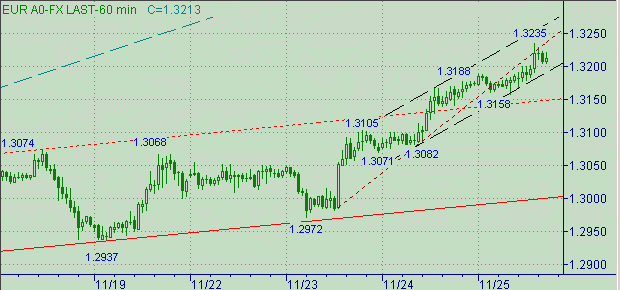 Рост курса евро/доллар продолжается и пропорционально увеличивается количество возможных вариантов этого роста с началом от 1.2972(23/11/04) (см. на рис. 3). Вот где можно применить свои способности людям с богатой фантазией. На данный момент имеем наиболее симпатичный следующий расклад: первая ветка - 1.2972-1.3105 длина 133п.; вторая - 1.3082-1.3188 длина 106п.; третья ветка началась от 1.3158 - см. на рис. 3. Структура третьей ветки не выглядит законченным движением. Хочется дальнейшего развития этого локального тренда. Целевые уровни для этого движения: 1.3265, 1.3290, 1.33220. 1.3370. Наиболее симпатичным выглядит уровень 1.3290.