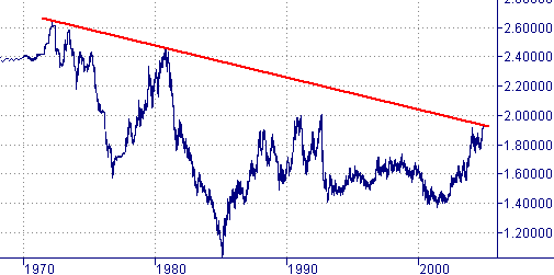 Ни обвал цен на нефть, ни ралли на Wall Street, ни негатив в Еврозоне, ни снижение прогнозов ЕЦБ ни чтобы то ни было еще не смогли разубедить рынок в истинности выбранного пути, а причиной тому - агрессивные продажи доллара против фунта и ряда других валют. Когда люди в панике фиксируют убытки трудно найти серьезную причину, кроме массивной интервенции, которая заставила бы их остановиться. Страх перед тем, что после прорыва 32-летней линии даунтренда (см. график) начнется неуправляемый процесс избавления от доллара заставляет многих играть на опережение. Основным драйвером усиления спекулятивной активности в фунте, напомним, стало отсутствие возражений официальных лиц Банка Англии к происходящему при том, что Банк Японии, ЕЦБ, ШНБ, Банк Канады, как и многие другие, выразили подобное недовольство. Фунт стал чуть ли ни единственной валютой, где спекулянтам позволили разгуляться на полную, позволив творить что душе угодно. На этом фоне доллару трудно было расти к другим ведущим валютам, даже несмотря на поддержку, опционную, интервенционную и т.д. "Никто не любил его (стерлинг) две недели назад", - напомнил один американский дилер. Действительно, говорят аналитики, в предшествующие недели, смешанные британские данные не позволяли видеть возможность очередного повышения ставки Банком Англии (8,9.12) в этом году; однако недавний поток сильных данных по рынку недвижимости и производству предполагает, что британская экономика все еще активна и справится с ужесточением монетарной политики. Фунт повысился на 8.8 % от последних минимумов (6 октября) на $1.7744 до максимумов в среду на $ 1.9324. Напротив, евро повысился на 9.1 % от минимумов (13 октября) на $1.2225 к недавним максимумам около $ 1.3335. Так что фунт даже сегодня выглядит в роли догоняющего. Цели роста стерлинга, по словам дилеров, включают недельный максимум 27 июля 1992 на $ 1.9320 и дневный максимум 9 сентября 1992 на $ 1.9535. Мэт Ван Дикхофф, технический аналитик Brown Brothers Harriman отмечает про рынок опционов: "Котировки опционов говорят мне, что чрезвычайно трудно купить любой краткосрочный кол-опцион на доллар против Aussie, шведской кроны, норвежской кроны, швейцарского франка, евро и иены", - сказал он. Единственная валюта, где рыночные игроки могут покупать краткосрочный опцион - стерлинг, добавил он. Маловероятно, что Бежевая книга окажет воздействие на доллар. Не секрет, у рынка сейчас иные драйверы. Применительно к евро им может стать неспособность преодолеть отметку $1.3350 в ближайшие дни, что маловероятно. Применительно к йене - усталость рынка стоять на месте в условиях полного отсутствия Банка Японии.