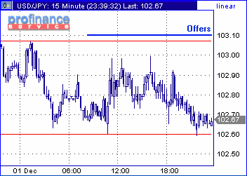 Консолидация в области отметки 102.70 означает потерю интереса в паре к моменту завершения торгового дня. На минимумах в области 102.60 доллару в обоих случаях оказал поддержку спрос со стороны различных фондов. Они же и вчера выкупали американскую валюту, активизировав свой спрос от 102.50. В данный момент предложения на продажу со стороны японских экспортеров отмечены дилерами на 103.10.