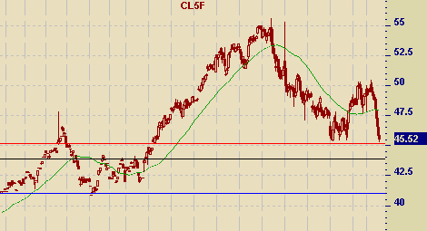 Январские нефтяные фьючерсы на NYMEX в данные момент находятся на 45.52. Ниже расположена ключевая ноябрьская поддержка на уровне 45.25 долларов за баррель (красная линия на графике), которая может сформировать горизонтальную линию тренда. Недельные осцилляторы имеют медвежьи настроения, поэтому существует разумный шанс пробития этой отметки. В этом случае следующую цель стоит отметить на 43.97 (черная линия на графике). Эта отметка является уровнем восстановления Фибоначчи 38.2 процента от повышения, начатого с апрельских минимумов 2003 года. Дальнейшая ключевая поддержка находится на уровне 41 доллара за баррель (синяя линия на графике). Это 50-процентное восстановление Фибоначчи, совпадающее с линией восходящего тренда, построенной с сентября 2003 года. Близлежащее сопротивление находится на уровне 46.00. Велика вероятность того, что для возобновления нисходящего движения, рынок сначала вернется к 100-дневной скользящей средней линии (47.07).
