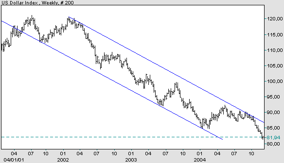 На спот-рынке индекс доллара в пятницу упал до минимумов на 80.94. Это новое дно индекса в установленной тенденции к понижению с максимумов июля 2001 года на 121.02. С технической точки зрения, пробитие отметки 81.18 означает открытые двери к тестированию уровня 77.70, которое может быть замечено в период с февраля по апрель. Верхняя граница для потенциального корректирующего ралли находится на уровне 82.23.