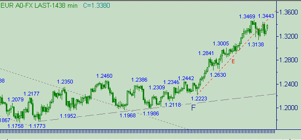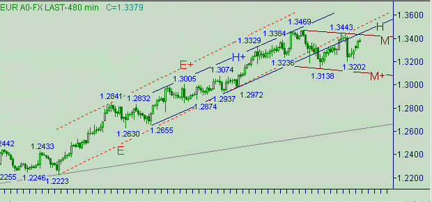 В текущей ситуации конкретных уровней открытия и закрытия позиции написать не можем в силу того о чем писали выше - введения дополнительного критерия в виде вспомогательных индикативных функций. Обозначим контуры: в случае тестирования вспомогательными индикативными функциями (например на графиках с периодом свечей 60 мин.) уровня (или области) "перекупленности" искать "опору" для постановки позиции на продажу. Как вариант "опоры" - поиск расчетных целевых уровней для восходящего движения с началом от 1.3202(16/12/04). Стоп-лосс - выше 1.3507. При выполнении перечисленных условий для постановки позиции даже в случае продолжения формирования евро/долларом up-тренда будем иметь большую вероятность технического down-отката, позволяющего передвинуть стоп-лосс на уровень открытия позиции (откат на 25-30п.) после вхождения в рынок. Цель для позиции на продажу - достижение вспомогательными индикативными функциями области "перепроданности" в совокупности с тестированием курсом технических расчетных уровней.