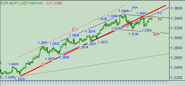 "Скока вешать в граммах?" - спрашивал один герой известного рекламного ролика. А у нас, коррекция продолжается, а мы как всегда готовы к любому дальнейшему развитию событий - графики на месте, все линии (в том числе и так полюбившаяся всеми линия E на рис. 2) отслеживаются. Положение линии E на рис. 2 с точностью "до граммов" не актуально, т.к. эта линия носит лишь вспомогательный (упрощает изложении материала) и описательный характер. Хотя нам эта линия очень даже нравится и мы от неё не отступим ни на шаг. Могут возникнуть сомнения по поводу канала M-M+, но эти все сомнению напрасны, т.к. этими двумя линиями мы просто обозначили коррекционную формацию от роста курса в пределах канала H-H+ на рис. 2, понимая, что вид этой коррекции может и отличаться от down-канала, например, формироваться в виде треугольника или горизонтального коридора. Да это и не важно, а важно другое - сможем ли мы поставить прибыльную позицию в этой коррекции или нет. Вот этим делом мы и пытаемся заниматься, не особенно гадая куда пойдет курс вверх или вниз - главное что бы остаться в плюсе.