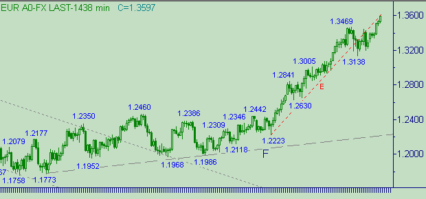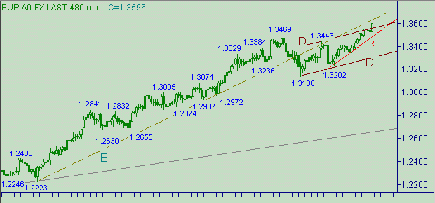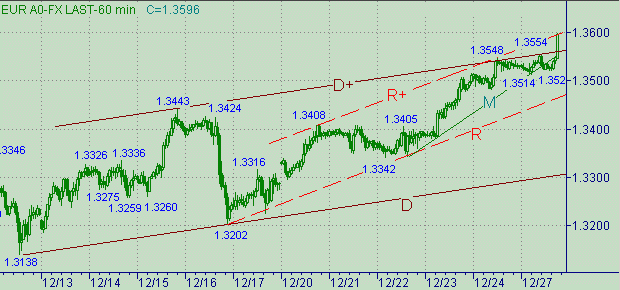 Рынок иллюстрирует на графиках книги по тех. анализу из раздела "Каналы" (см. на рис. 3) - евро/доллар самым честным образом тестируют линии каналов R+ и D+. Структура движения в канале D-D+: первая up-ветка 1.3138(10/12/04)-1.3443(15/12/04) длина 305п.; вторая ветка с началом от 1.3202. Канал R-R+ на рис. 3 и обозначает нам вторую ветку в канале D-D+. Структура канала R-R+ на рис. 3: первое восходящее движение - 1.3202-1.3408 длина 206п.; второе началось от 1.3342. Спорный вопрос о законченности или незаконченности второй ветки. Она обозначена линией M, которая пробита ценой. Поэтому можно в первом приближении считать это движение законченным. Но рынок может пойти на формирование расширенного второго движения, т.е. состоящим так же из поддвижений. Поэтому можно планировать и продолжение второго движения.