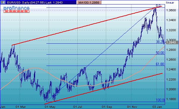 Пока пара евро/доллар пессимистично настроена в отношении возобновления роста. Текущая ситуация предполагает продолжение нисходящей тенденции. Антиинфляционные комментарии членов федерального правительства, ожидания повышения ставок и репатриации прибылей американскими экспортерами, оказывают в данный момент существенную поддержку американской валюте. Скорее всего, уровень восстановления Фибоначчи 38.2% окажется окончательно пробит, и следующую опору евро найдет лишь на отметке 1.2870, представляющей собой текущее значение 100-дневной скользящей средней линии. Ее тестирование следует ожидать в ближайшие дни. При этом пробитие указанной отметки говорит о продолжении падения евро до области 1.2500/1.2480 над уровнем Фибоначчи 61.8.