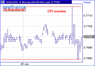 Как сообщило Бюро Статистики Австралии, индекс потребительских цен в 4 квартале вырос на 0.8 процента по сравнению с предыдущей четвертью. В течение года CPI повысился на 2.6 процента. Основной причиной роста стал рост топливных цен. Аналитики прогнозировали инфляционный рост на 0.6% по сравнению с предыдущим кварталом. Ожидания годового показателя составляли рост на 2.4 процента. Первоначальной реакцией австралийской валюты был рост против доллара США. Пара протестировала отметку 0.7515. Однако аусси тут же был отброшен назад оферами продавцов. В настоящий момент пара стабилизировалась около уже привычной фигуры 0.7700. Котировки бондов отреагировали падением. Трехлетние фьючерсные контракты упали до 94.77 с отметки 94.81.