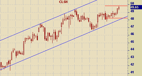 Однако, не смотря на существенный пессимизм, рынку не удалось остаться на суточных максимумах. Давление на настроения инвесторов по-прежнему оказывал рост нефтяных котировок. Мартовские фьючерсы на NYMEX завершили торги ростом на 83 цента до отметки 49.64 доллара за баррель.