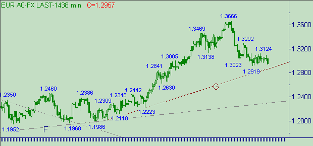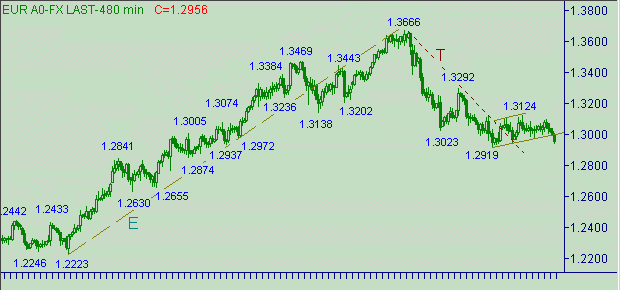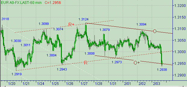 Попытка евро/доллар вырваться как из границ канала R-R+ (см. на рис. 3) так и из коррекционной формации с началом от 1.2919(20/01/05) от нисходящего движения вдоль линии T на рис. 2. Сейчас на первый план выходит проблема 1.2900. Этот уровень психологически важный и технически-приметный. В случае выхода курса ниже 1.2900 важным интервалом, расположенным ниже текущего значения цены, рассматриваем область 1.2750-1.2775. Между 1.2900 и 1.2750 имеем ещё один приметный уровень - 1.2860 (текущее положение линии G на рис. 1).