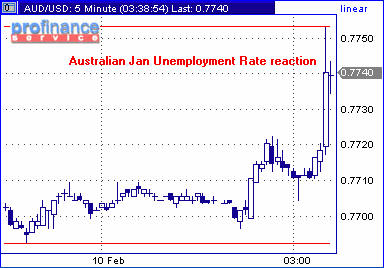 Австралийское Бюро Статистики представило вниманию участников рынка пакет важной макроэкономической статистики. Так уровень безработицы в январе соответствовал прогнозам аналитиков и остался на 28-летнем минимуме 5.1 процентов. А вот данные по рынку труда оказались просто удивительными. Так январская занятость в Австралии выросли на 44500 новых рабочих мест, в то время как аналитики прогнозировали рост лишь на 5000. Фактический результат почти в 9 раз превысил ожидания. Такой всплеск на рынке труда говорит о том, что высказываемые ранее опасения RBA в отношении инфляции были не напрасными. Напомним, что RBA нацелен сдерживать годовой уровень инфляции на уровне 2/3 процентов. Складывающаяся ситуация позволяет утверждать, что в ближайшем будещем Банк Австралии будет вынужден повысить ставки. Курс австралийской валюты в качестве реакции на опубликованные данные стремительно взлетел с 0.7710 до 0.7753.