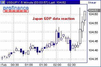 Курс пары доллар/йена подскочил до отметки 104.66, что стало реакцией на опубликованные данные по ВВП Японии за 4 квартал. Показатель, как в годовом, так и в квартальном исчислении оказался хуже прогнозов, более того, он отразил отрицательный экономический рост. Согласно прогнозам аналитиков, годовой рост ВВП ожидался на уровне 0.5%, рост по отношению к предыдущему кварталу ожидался на уровне 0.1 процента. Фактические цифры отразили снижение квартального ВВП на 0.1% и годового на 0.5 процента. К тому же на 0.3% снизились расходы потребителей и на точно такую же величину упали инвестиции. Аналитики в Токио полагают, что в ближайшее время вполне возможно тестирование сопротивления на 105.00. Тем не менее, Такеши Иба, глава Calyon FX утверждает, что азиатская сессия в паре доллар/йена останется ограничена диапазоном 104.30/104.80. Продажи японских инвесторов полученных купонных выплат по американским облигациям и ожидания выступления Гриспена будут сдерживать падения йены, но после этого фокус рынка должен вернуться к слабым фундаментальным принципам, что со времени сформирует настроение, соответствующее стратегии "Продавай Японию".